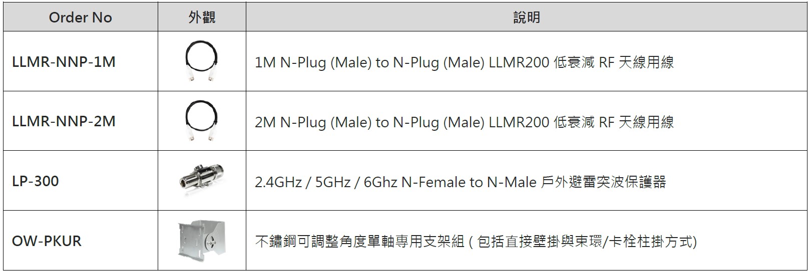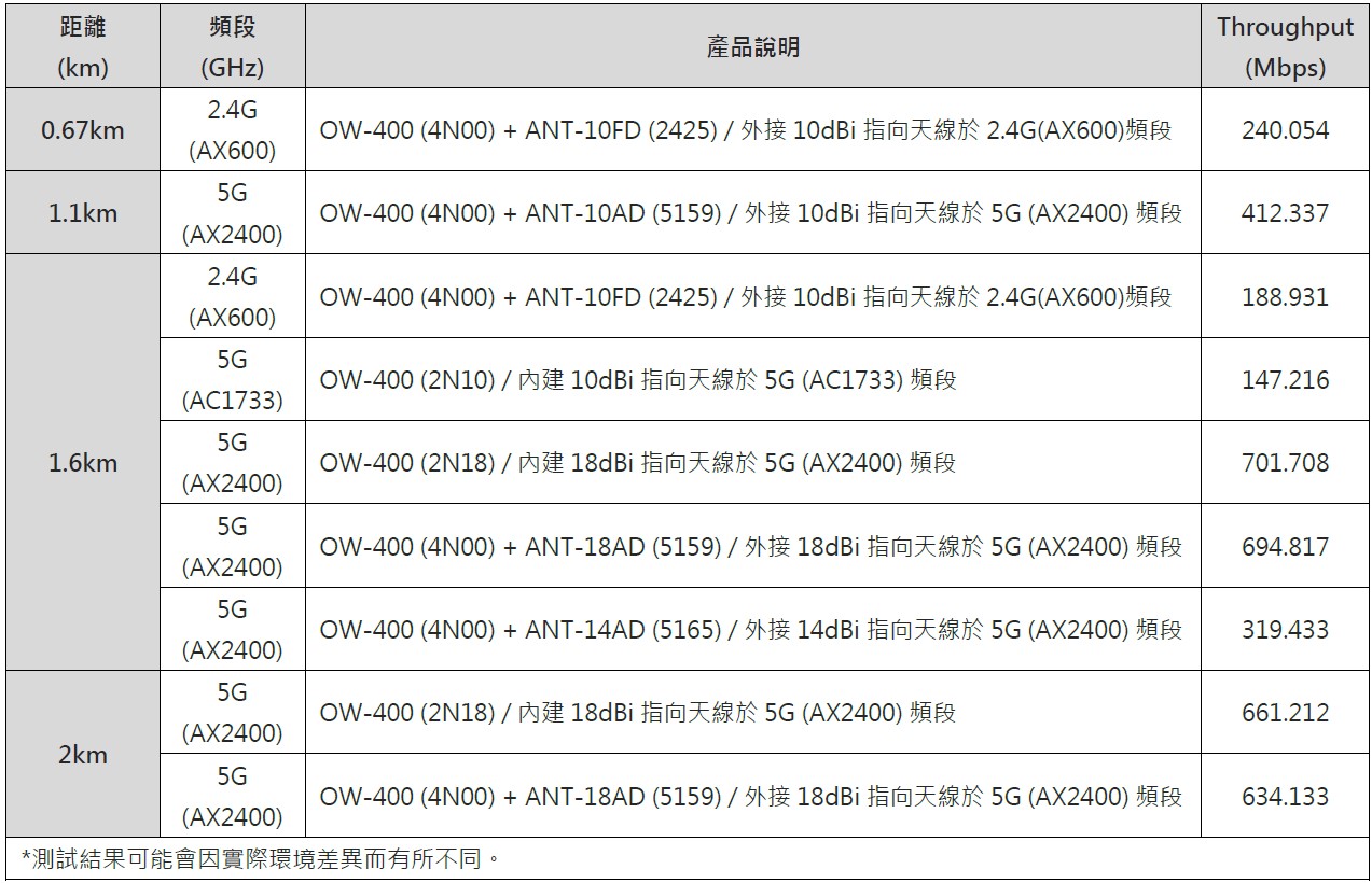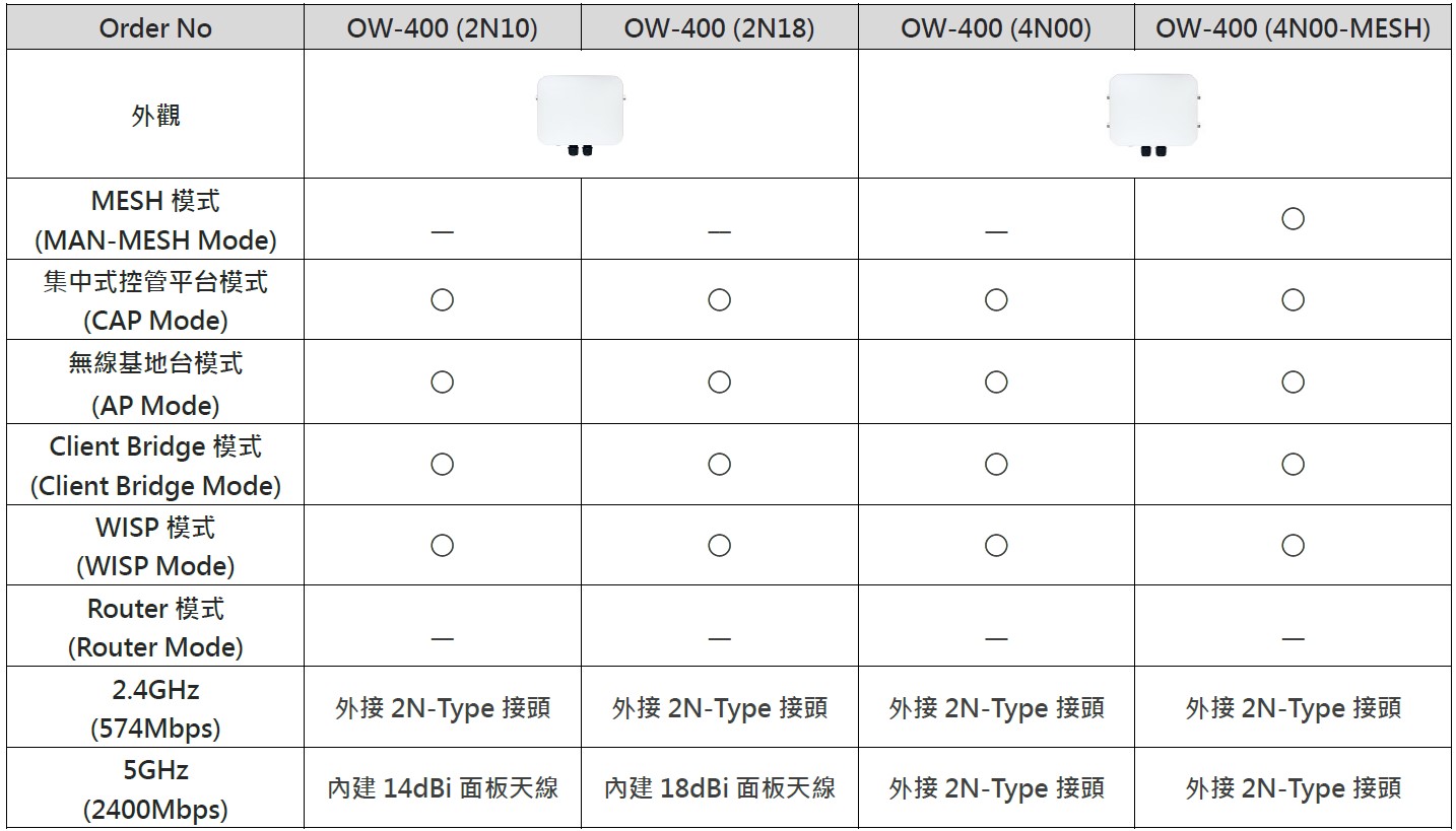 | 天線 | OW-400 (2N10) 2.4GHz : 支援2個 N-Type防水接頭 5GHz : 內建 10 dBi 5Ghz 2×2 雙極化指向性面板天線 |